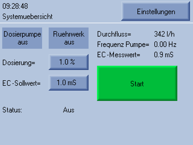 Die Bedienung der Dosieranlagen und die Anzeige der Parameter erfolgt über ein Touch Display. Durch die Anzeige aller wesentlichen Betriebsdaten und die übersichtliche Menüführung ist die Bedienung sehr einfach. Um eine hohe Betriebssicherheit der Anlage zu erreichen, sind in der Ausführung mit EC-Messung verschiedene Überwachungsfunktionen einstellbar. Die Textanzeige kann wahlweise auf Deutsch oder Englisch erfolgen.